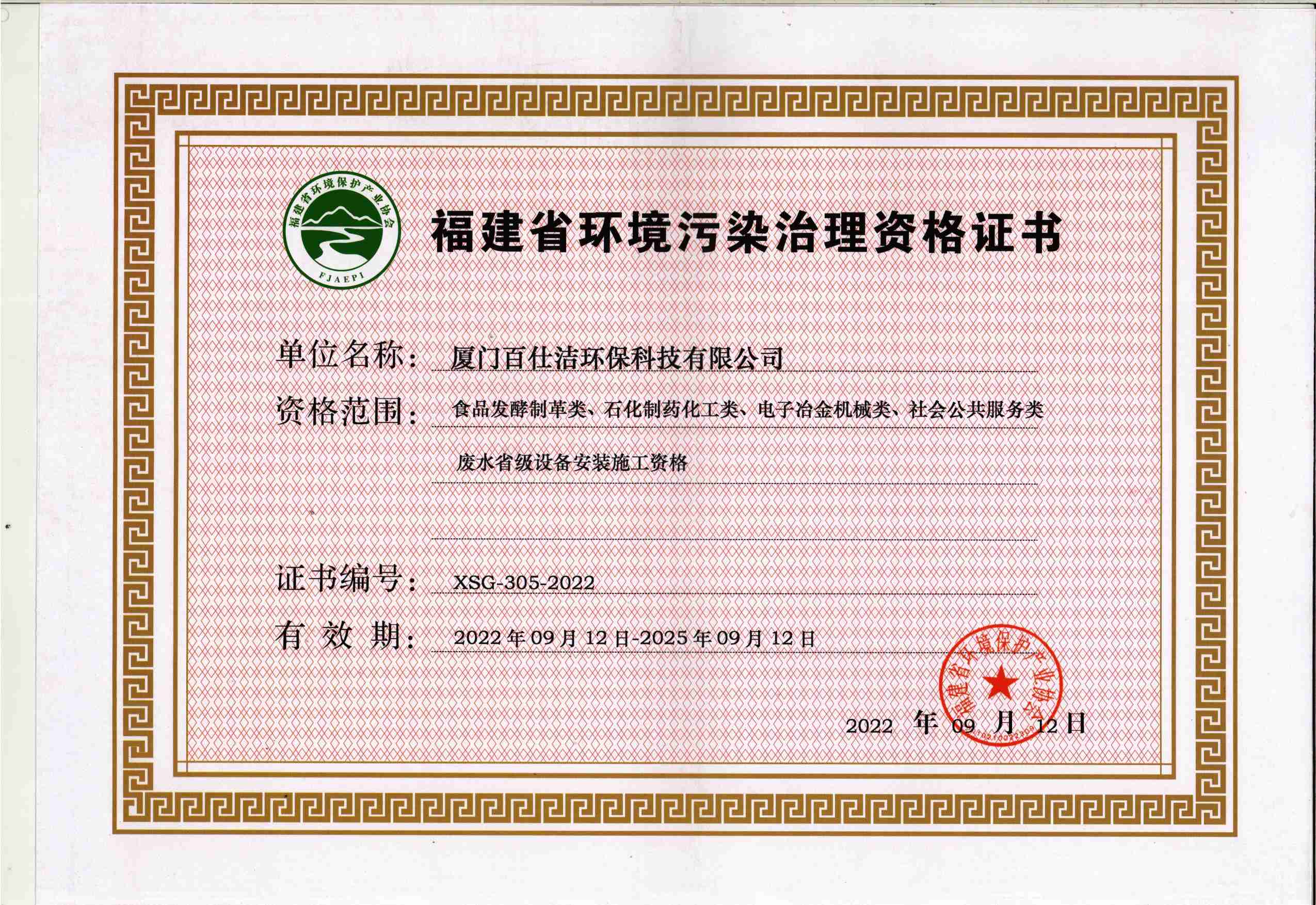 福建省環(huán)境污染治理設(shè)計(jì)資格證書